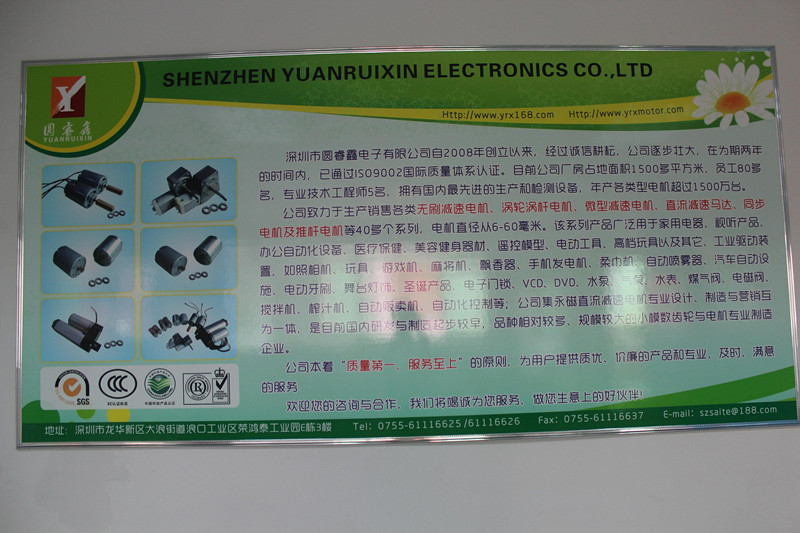 深圳市圓睿鑫電子有限公司自2008年創(chuàng)立以來(lái),經(jīng)過(guò)誠(chéng)信耕耘,在為期兩年的時(shí)間內(nèi),已通過(guò)ISO9001:2000國(guó)際質(zhì)量體系認(rèn)證。公司廠房占地面積2000多平方米,員工100人,專業(yè)技術(shù)工程師6名,擁有國(guó)內(nèi)最先進(jìn)的生產(chǎn)和檢測(cè)設(shè)備,年產(chǎn)各類減速電機(jī)超過(guò)2~300萬(wàn)臺(tái)。因公司發(fā)展需要,于2020年底,將生產(chǎn)基地遷往擁有最美小鎮(zhèn)之稱的東莞市清溪鎮(zhèn),依山傍水,依托美麗的大自然環(huán)境和地方文化,全新的東莞市圓睿鑫電子有限公司將借助深圳母公司平臺(tái),一步步走上新的臺(tái)階。 東莞公司將繼續(xù)致力于生產(chǎn)銷售各類無(wú)刷減速電機(jī) 渦輪渦桿電機(jī),微型減速電機(jī),直流減速馬達(dá),交流手搖發(fā)電機(jī)、同步電機(jī)及空心杯電機(jī)等,電機(jī)直徑從6-60毫米為定位,系列產(chǎn)品廣泛用于智能家電、智能辦公自動(dòng)化設(shè)備、智能醫(yī)療、美容健身器材、遙控模型、電動(dòng)工具、高檔玩具以及其它工業(yè)驅(qū)動(dòng)裝置,如高檔玩具、游戲機(jī)、麻將機(jī)、飄香器、手機(jī)發(fā)電機(jī)、柔巾機(jī)、自動(dòng)噴霧器、汽車自動(dòng)設(shè)施、電動(dòng)牙刷、舞臺(tái)燈飾、圣誕產(chǎn)品、智能電子門(mén)鎖、VCD、DVD、水泵、氣泵、水表、煤氣閥、電磁閥、攪拌機(jī)、榨汁...